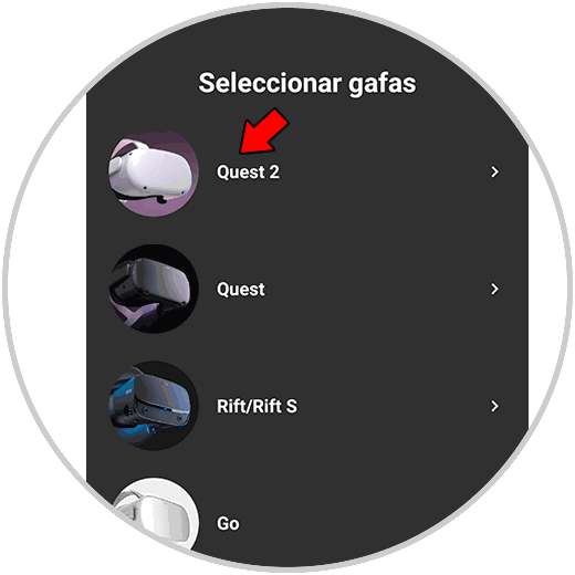 Pulsaremos en "Quest 2" dentro del listado de opciones: