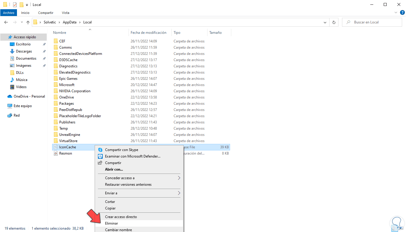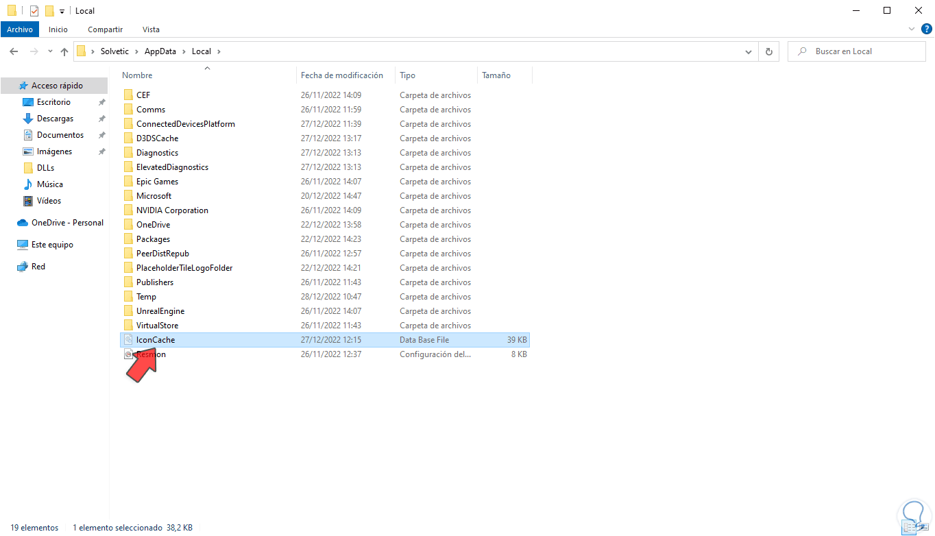 Ahora será visible. Seleccionamos el archivo "IconCache", damos clic derecho y luego damos clic en "Eliminar"