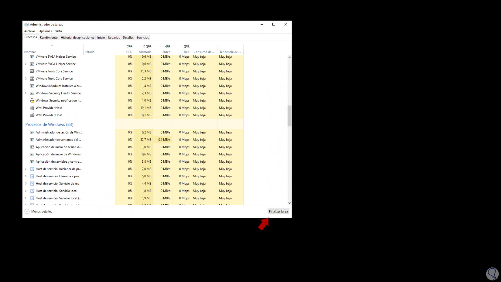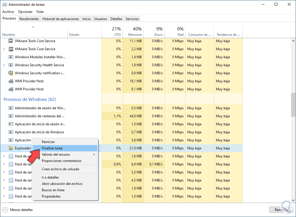 En la ventana del Administrador seleccionamos el "Explorador de Windows", damos clic derecho y seleccionamos "Finalizar tarea":