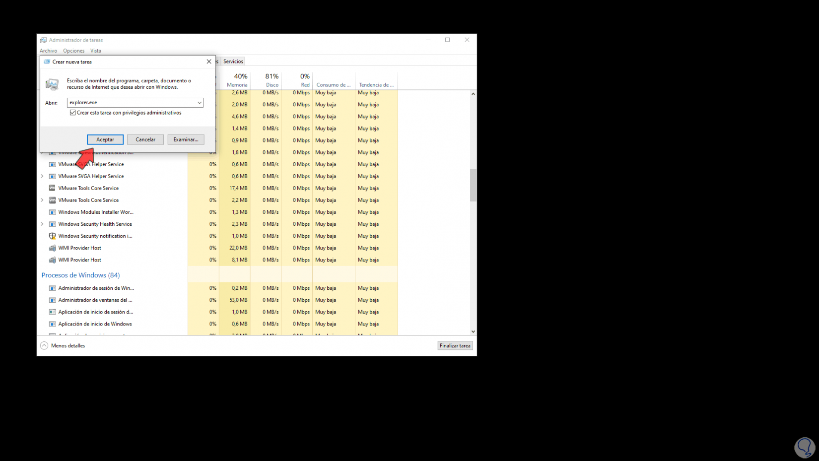 Ingresamos "explorer.exe" y activamos la casilla "Crear esta tarea con privilegios administrativos":