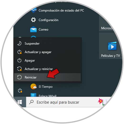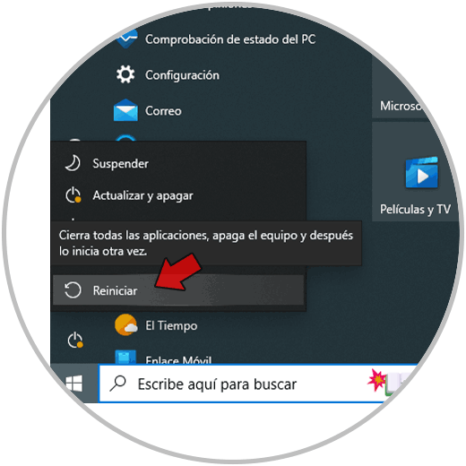 Un reinicio del sistema operativo ayudará a refrescar todos los procesos y servicios propios dando lugar a que los iconos en la barra de tareas ahora sean visibles, reiniciamos Windows 10: