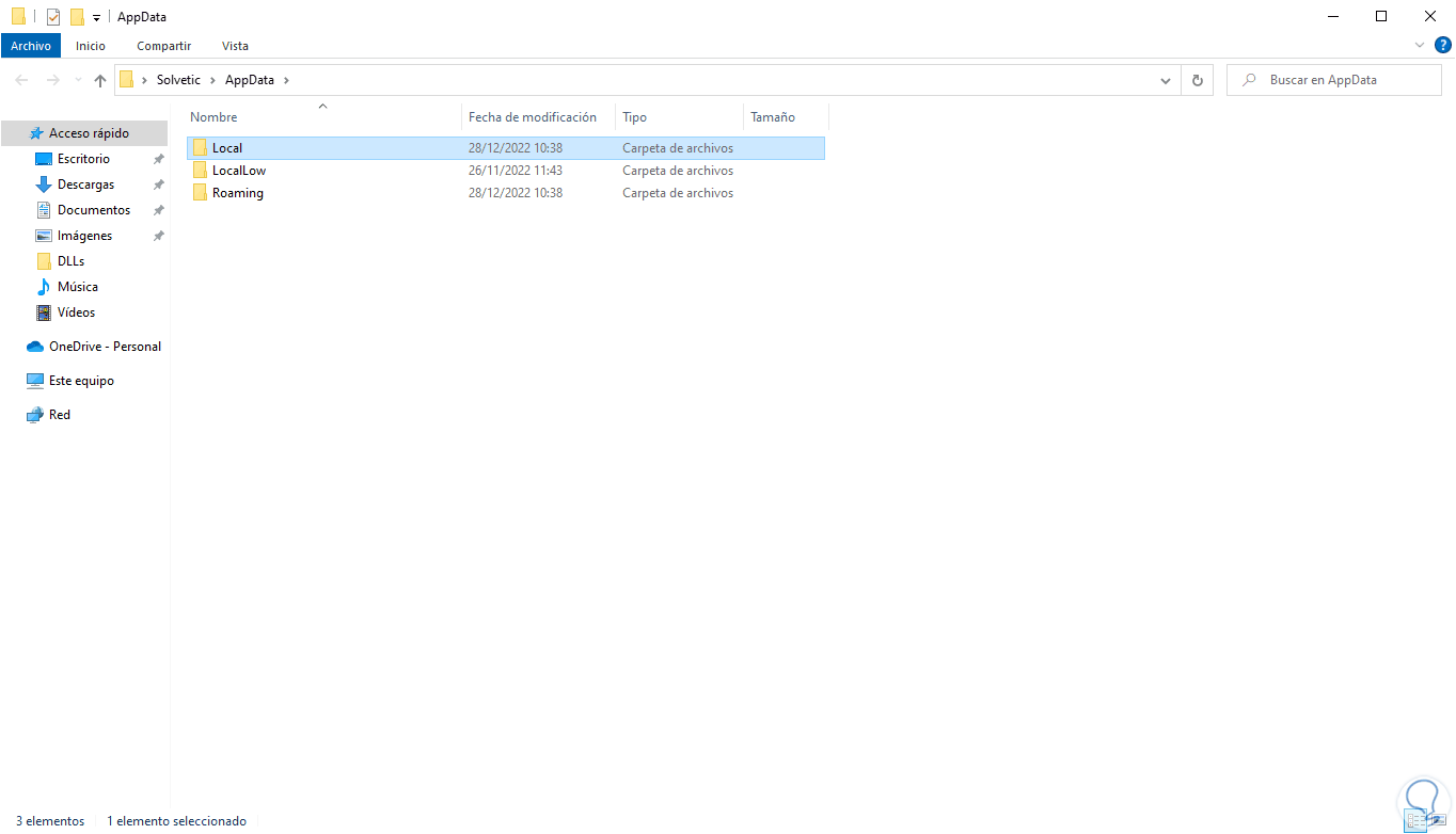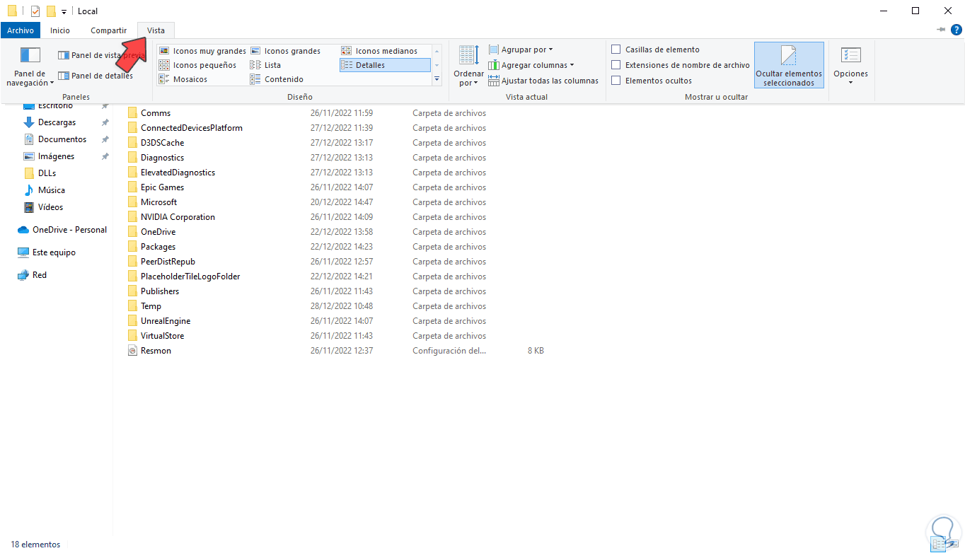 Accedemos a la carpeta "Local" y este archivo estará oculto por seguridad, para verlo, vamos a la pestaña "Vista":