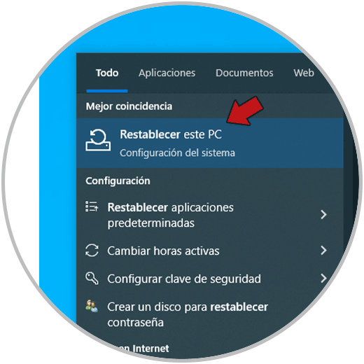 Para esto en el buscador ingresamos "restablecer" y luego damos clic en "Restablecer este PC":