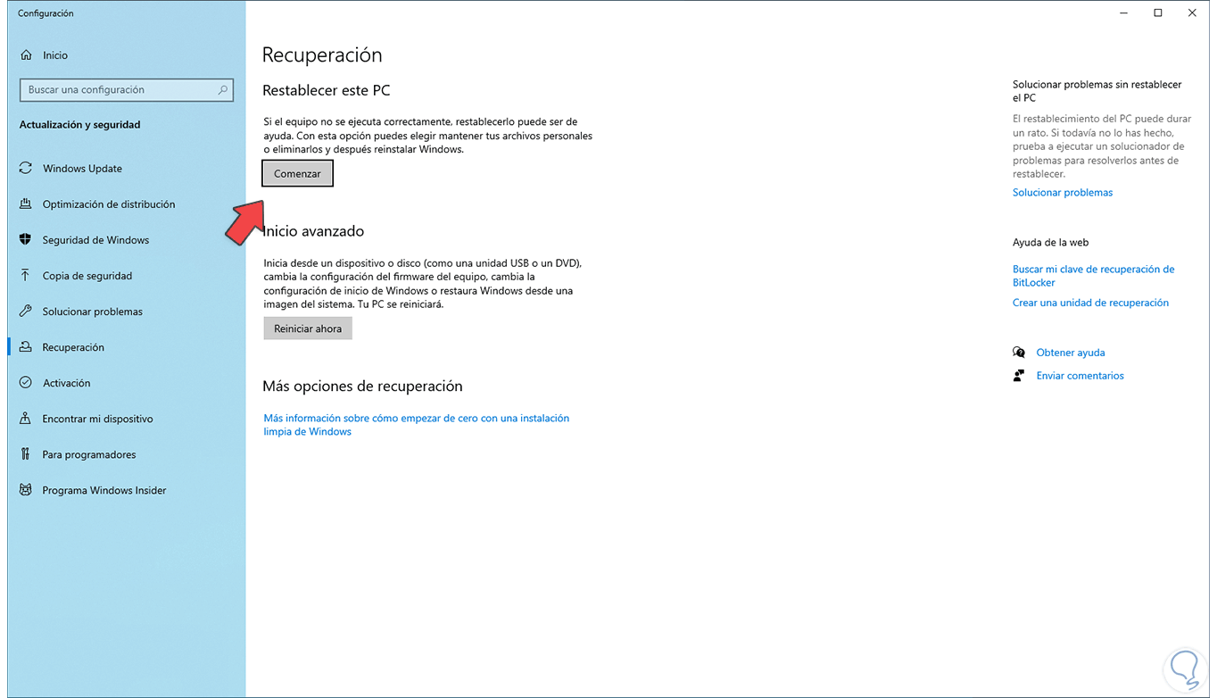Se abrirá lo siguiente. Damos clic en "Comenzar" en la sección “Restablecer este PC”
