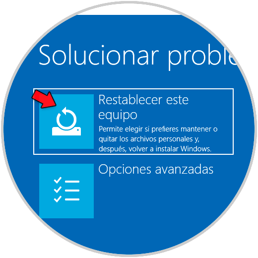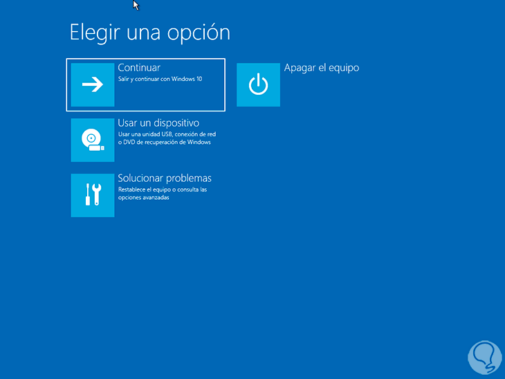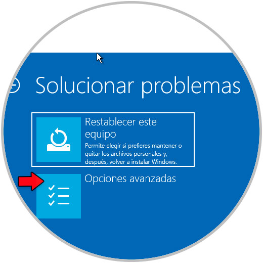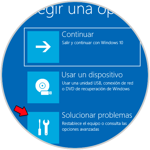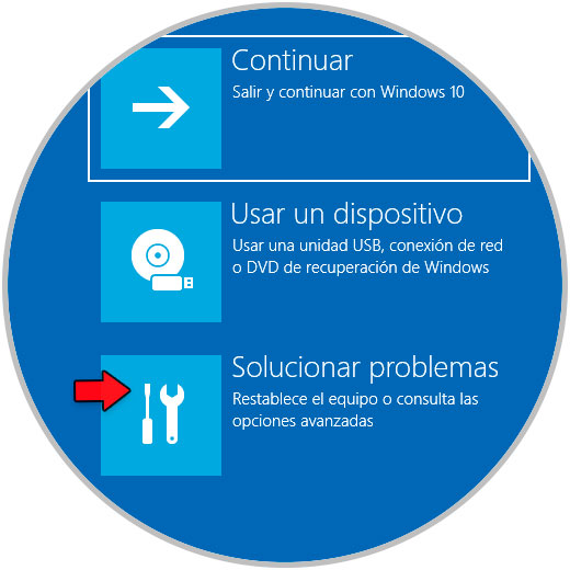 Reiniciamos Windows 10 en modo avanzado como hemos visto y damos clic en “Solucionar problemas”: