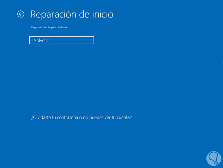 Damos clic en “Reparación de inicio” y posterior a ello seleccionamos el usuario: