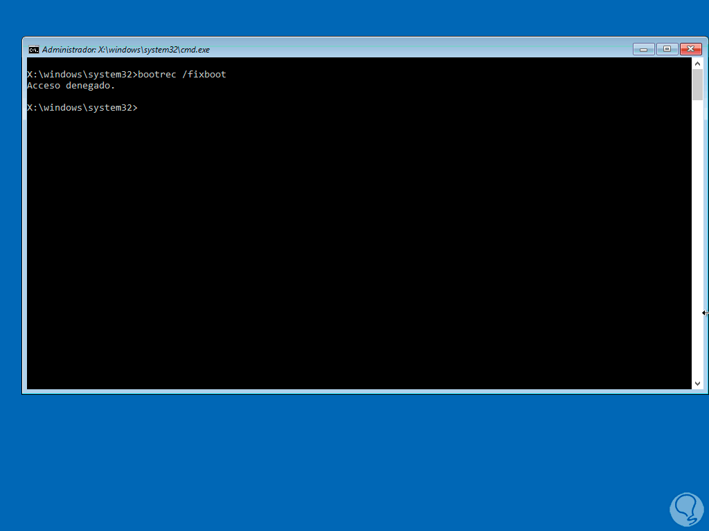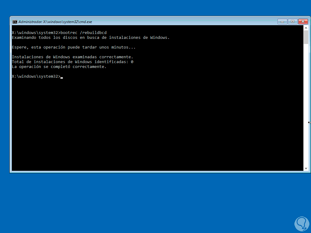 Se abrirá la consola de CMD integrada ejecutamos el siguiente comando para corregir errores de MBR (Master Boot Record):