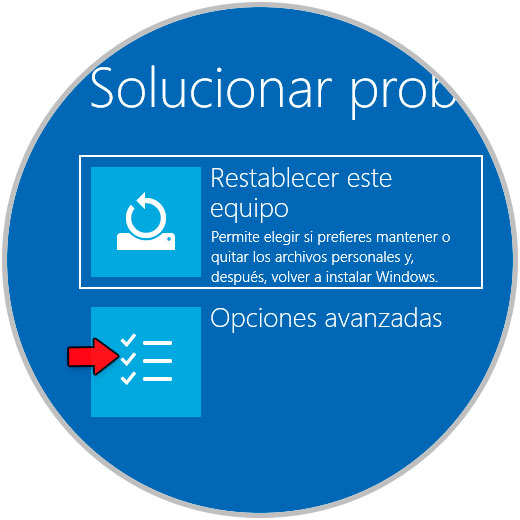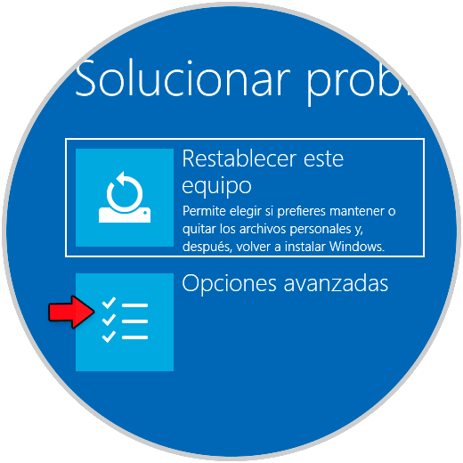 Damos clic en “Solucionar problemas” y luego damos clic en “Opciones avanzadas”: