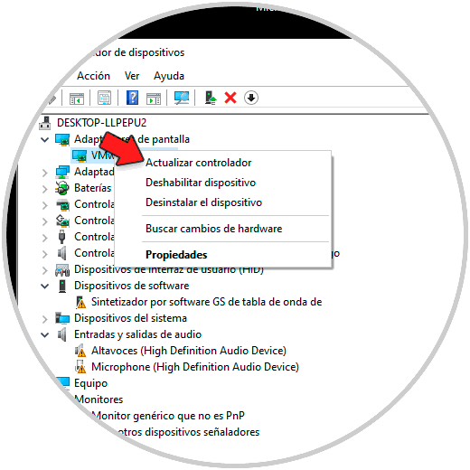 En "Adaptadores de pantalla" damos clic derecho sobre el controlador y seleccionamos "Actualizar controlador":
