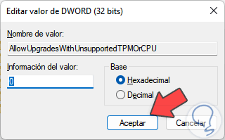 Esta es una clave relacionada con configuraciones del arranque de Windows 11, allí damos doble clic sobre el valor "AllowUpgradesWithUnsupportedTPMOrCPU" para ver sus propiedades: