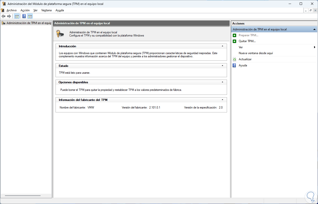 Damos clic en Aceptar para confirmar que el TPM esté activo y ver algunas de sus propiedades: