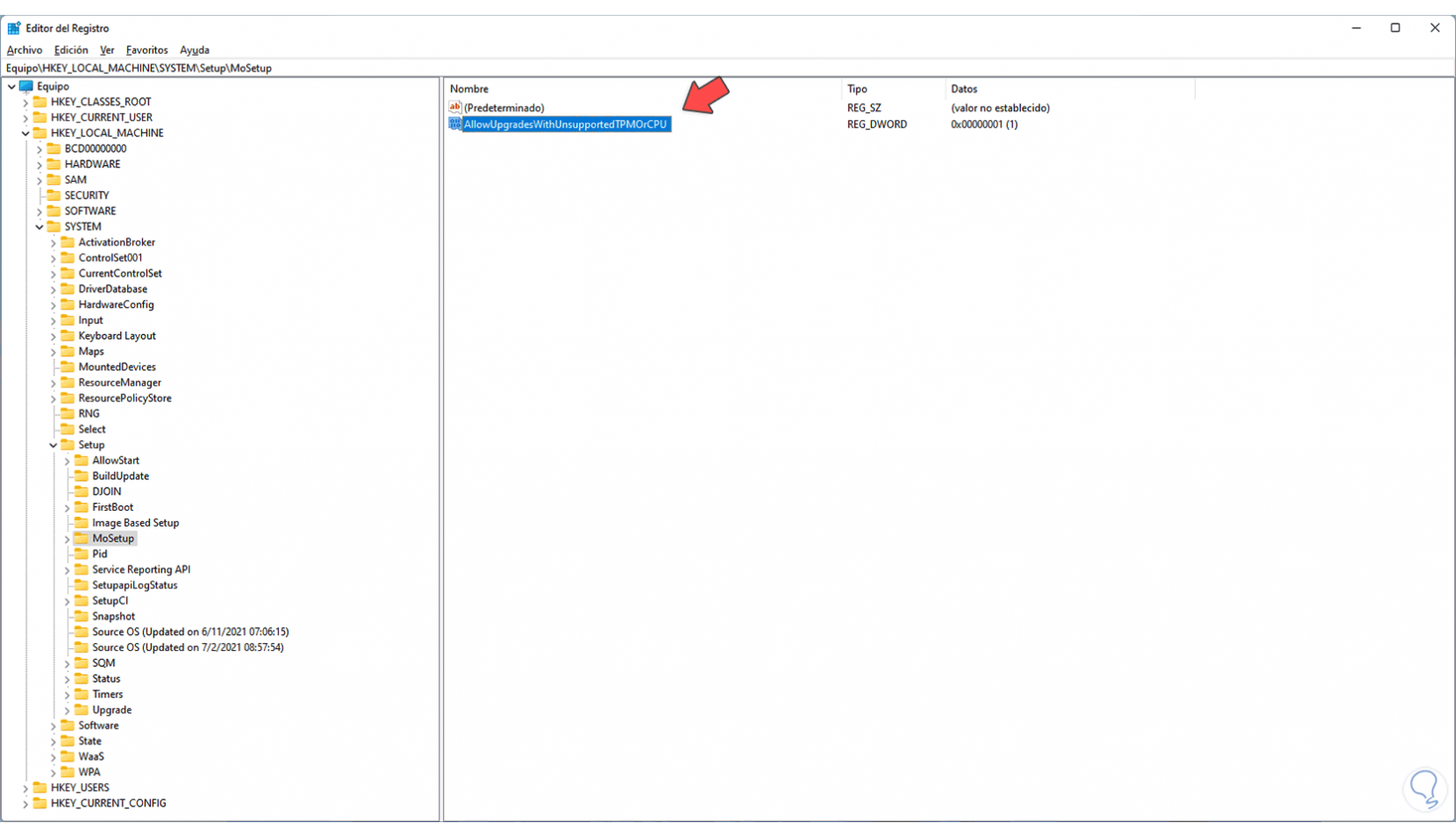 Este valor AllowUpgradesWithUnsupportedTPMOrCPU permite realizar actualizaciones donde no se soporta TPM de modo que con ello será posible acceder a Valorant sin que salte el error en cuestión.