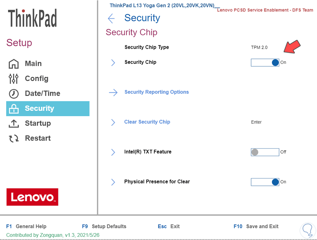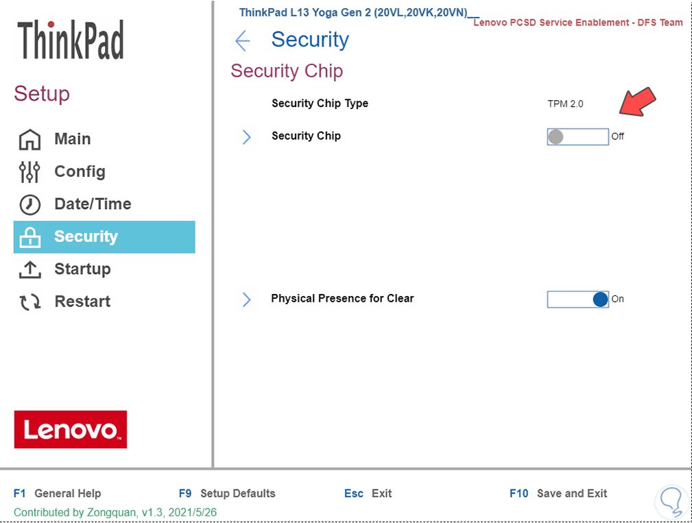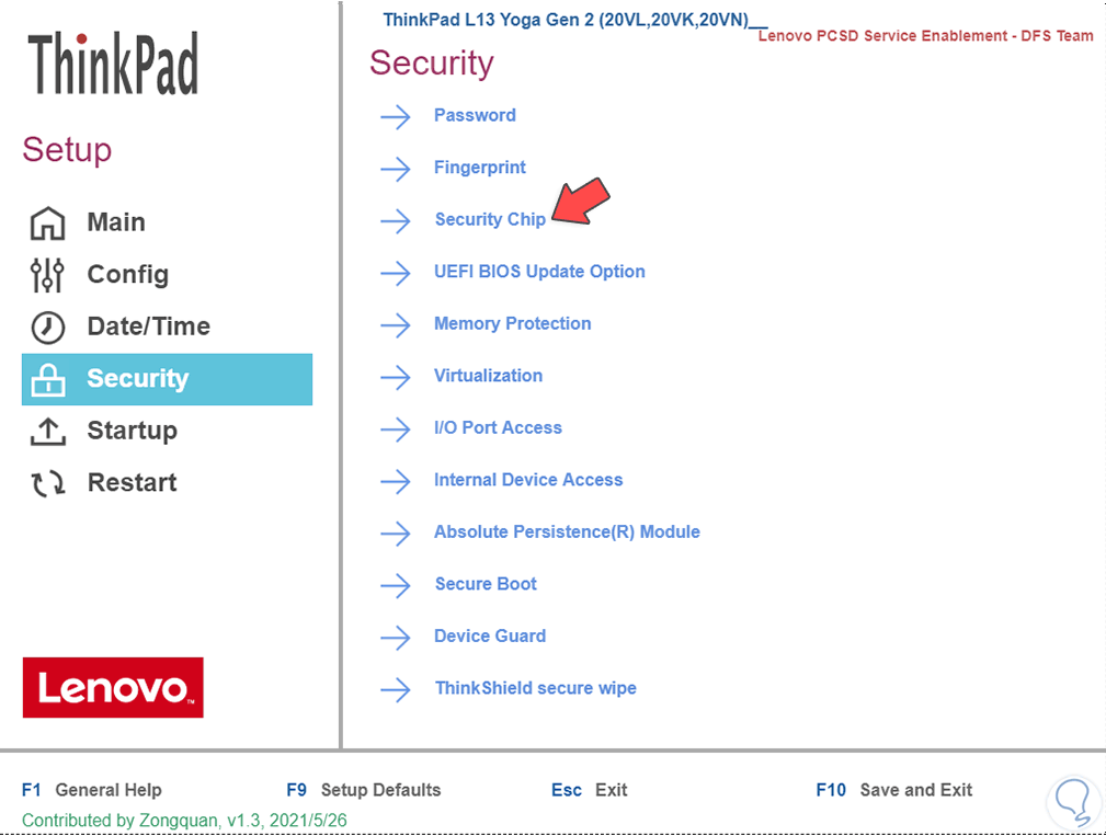 En otros casos puede ser así. En la sección de seguridad "(Security) damos clic en "Security Chip" para ver lo siguiente: