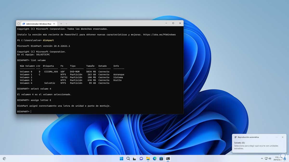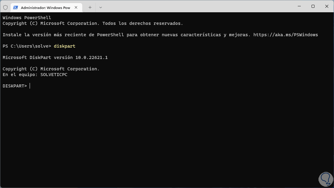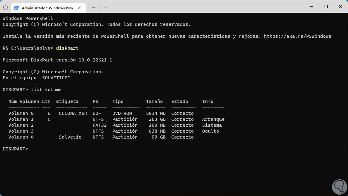 Seleccionamos el disco que no es visible en Windows con este comando:
