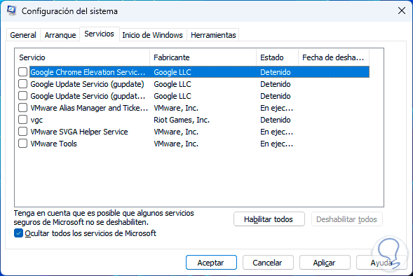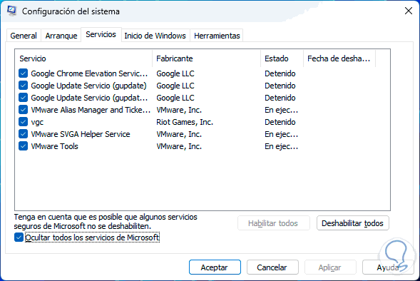Activamos la casilla "Ocultar todos los servicios de Microsoft":