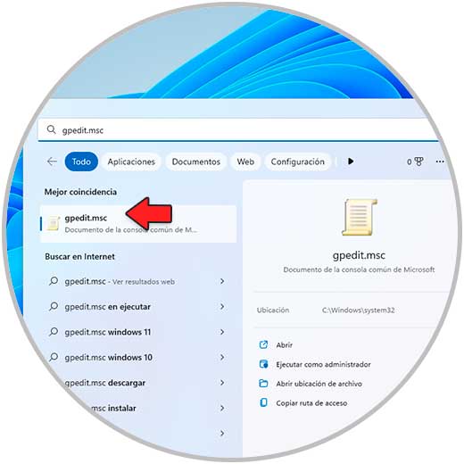 En el buscador de Inicio ingresamos "gpedit.msc" y abrimos la consola: