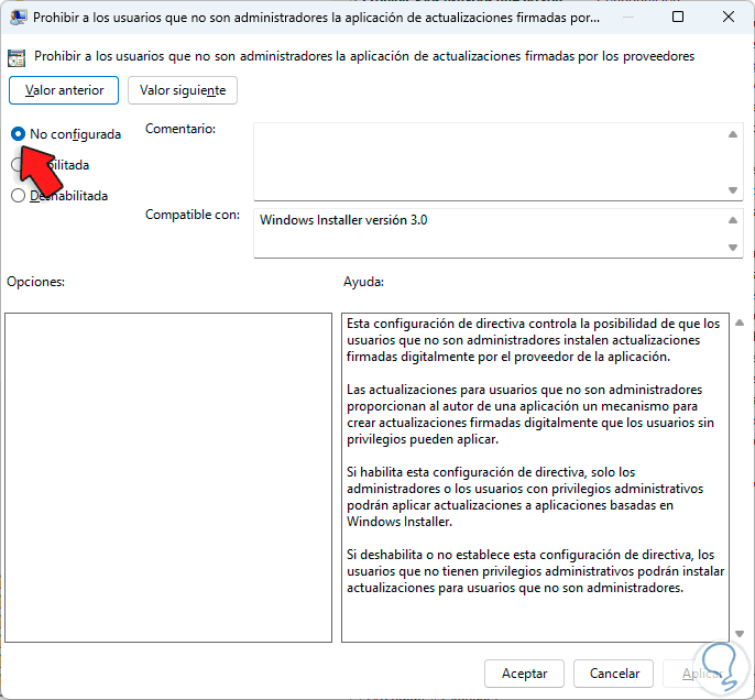 Damos doble clic sobre la política "Prohibir a los usuarios que no son administradores la aplicación de actualizaciones que no son firmadas por los proveedores" y validamos que su estado sea "No configurada" O "Deshabilitada":
