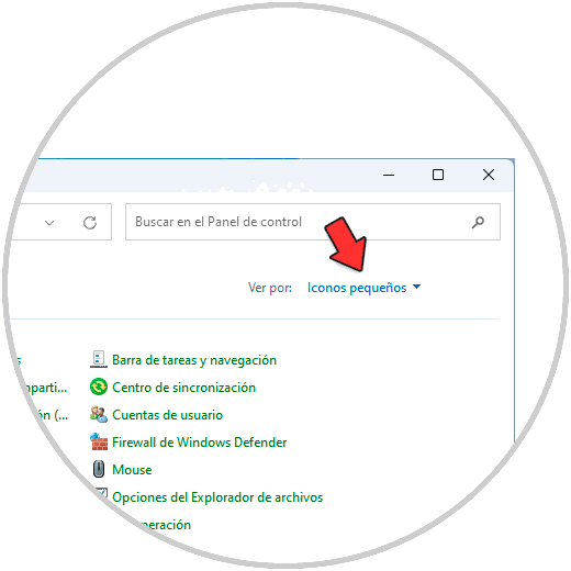 En este caso abrimos el Panel de control y en "Ver por" establecemos "Iconos pequeños":