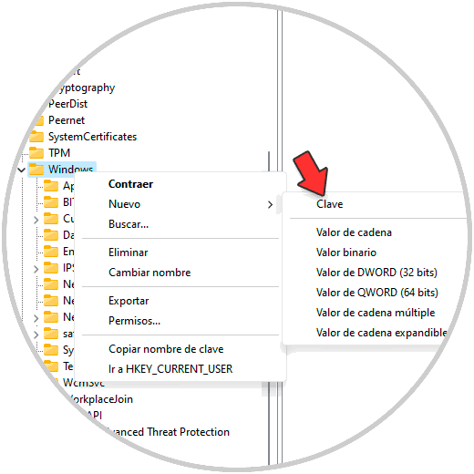 Damos clic derecho sobre "Windows" y seleccionamos "Nuevo - Clave":