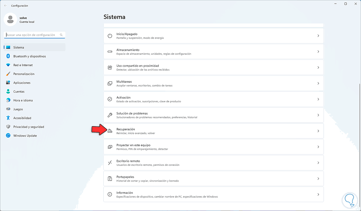 "Inicio - Configuración - Sistema - Recuperación"