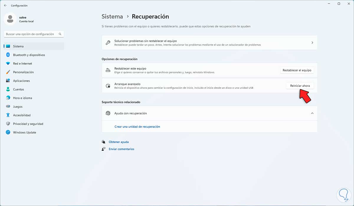 Allí damos clic en "Reiniciar ahora":