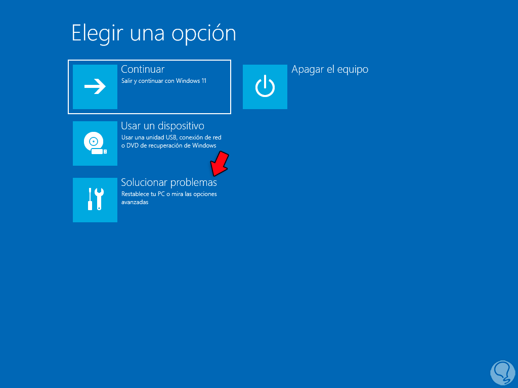 Damos clic en “Solucionar problemas” y luego clic en “Opciones avanzadas”: