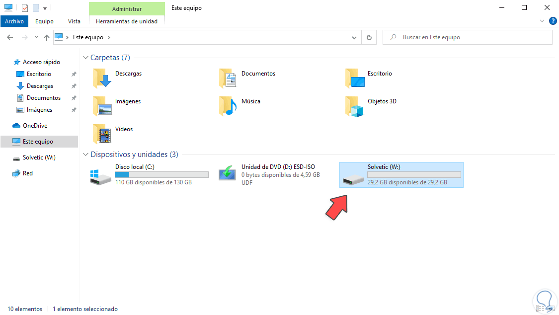 Es uno de los métodos más simples y por ende más usados para este proceso, en primer lugar abrimos el Explorador de archivos y comprobamos la partición a borrar: