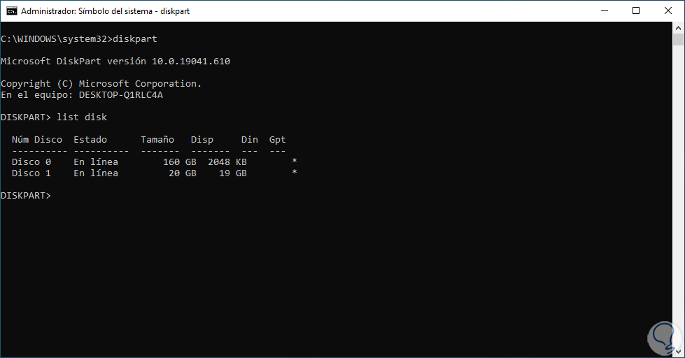 En la consola de CMD accedemos a Diskpart con el comando diskpart y listamos esta vez los discos: