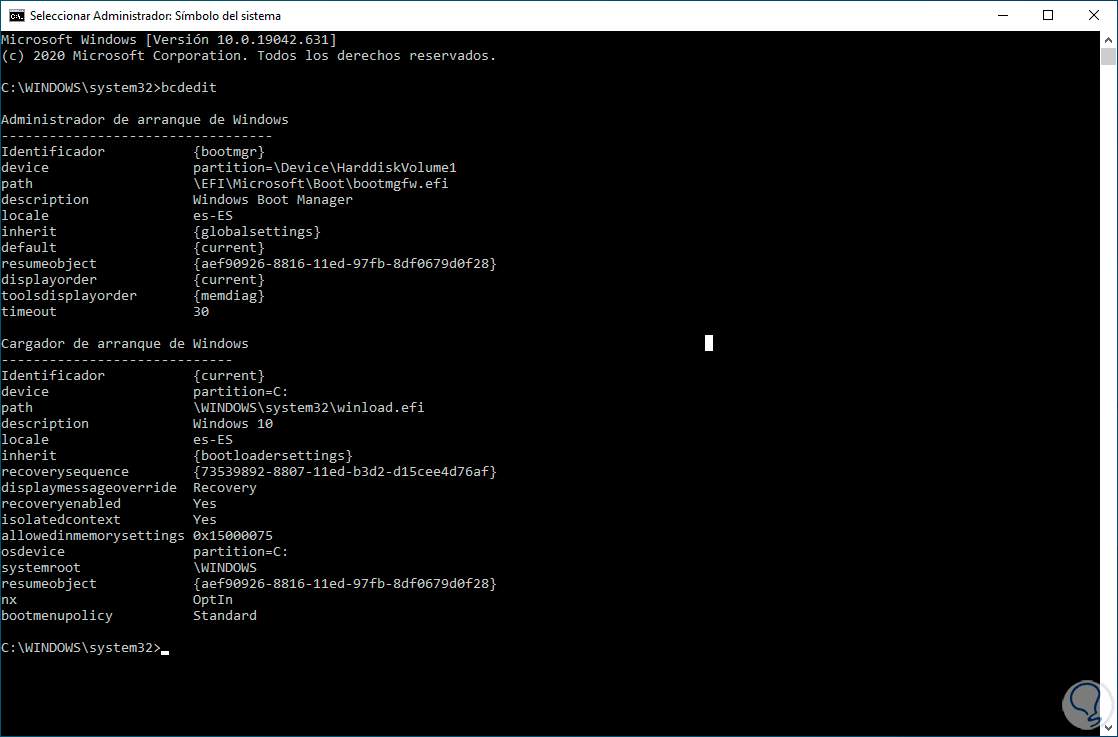 Nota: para validar el estado de la reparación automática en Windows 10 en la consola de CMD ejecutamos “bcdedit”: