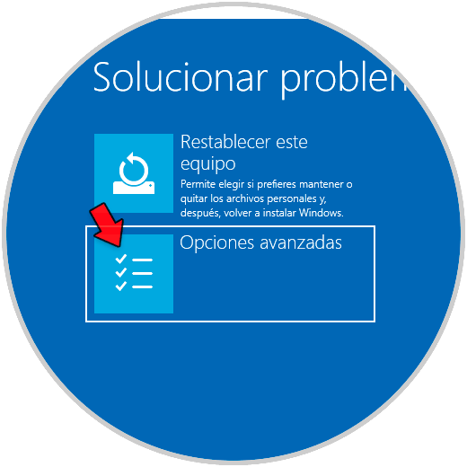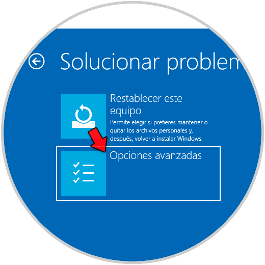Damos clic en "Opciones avanzadas" y luego damos clic en “"Solucionar problemas”: