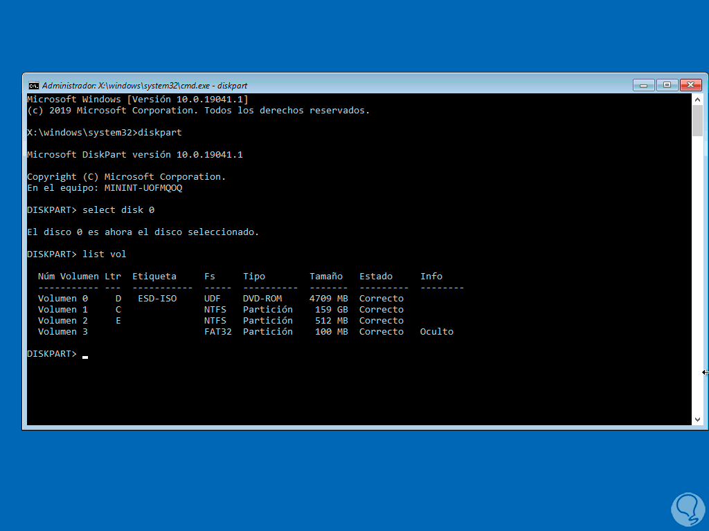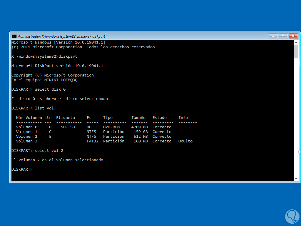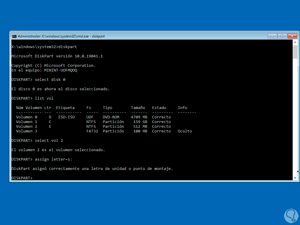 Allí comprobamos que la unidad C este ligada a donde esta instalado Windows, muchas veces la letra C esta asignada a la partición reservada, en ese caso es posible asignar una nueva letra a la partición reservada, seleccionamos el volumen: