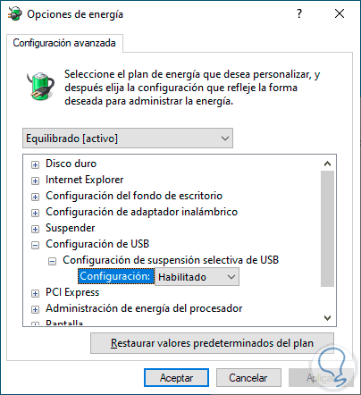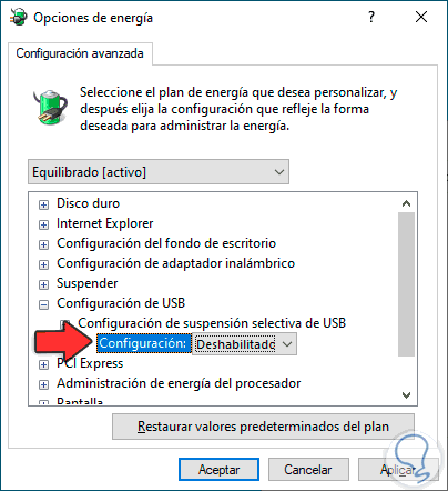 Esta es una opción integrada en Windows 10 con la cual es posible que el sistema administre la energía de la USB, al conectarse al puerto esta recibe una carga determinada de energía y si Windows 10 la administra puede llegar a darse la situación que el sistema apague la USB dando lugar al error de solicitud de descriptor.