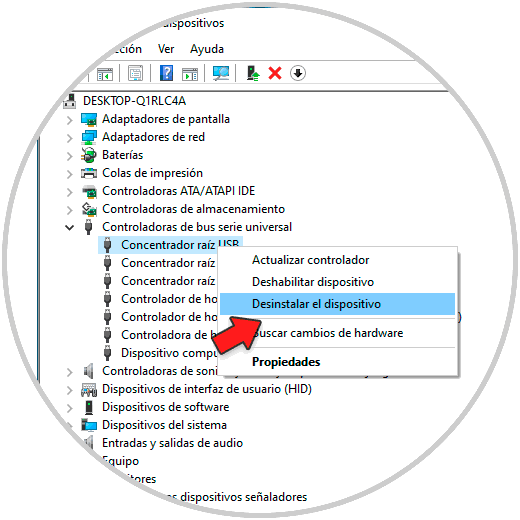 En "Controladoras de bus serie universal" damos clic derecho sobre el USB con error y allí seleccionamos la opción "Desinstalar el dispositivo":