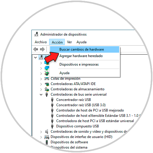 Ahora es posible reiniciar el PC para que se instalen automáticamente los controladores o ir al menú "Acción - Buscar cambios de hardware":