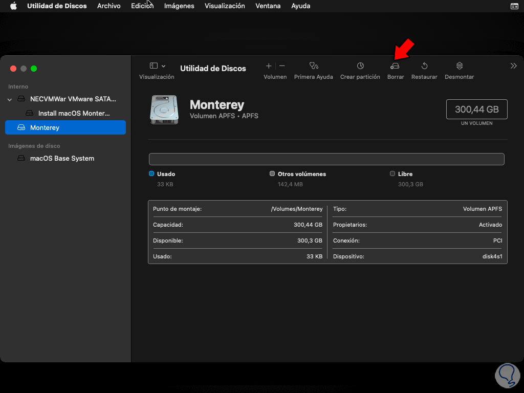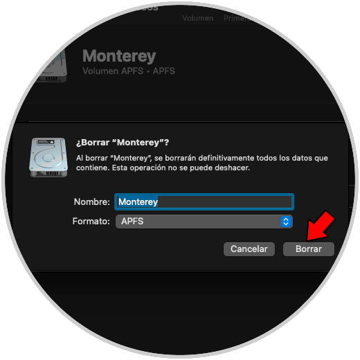 Asignamos un nombre y establecemos el formato APFS, damos clic en “Borrar” para inicia el proceso: