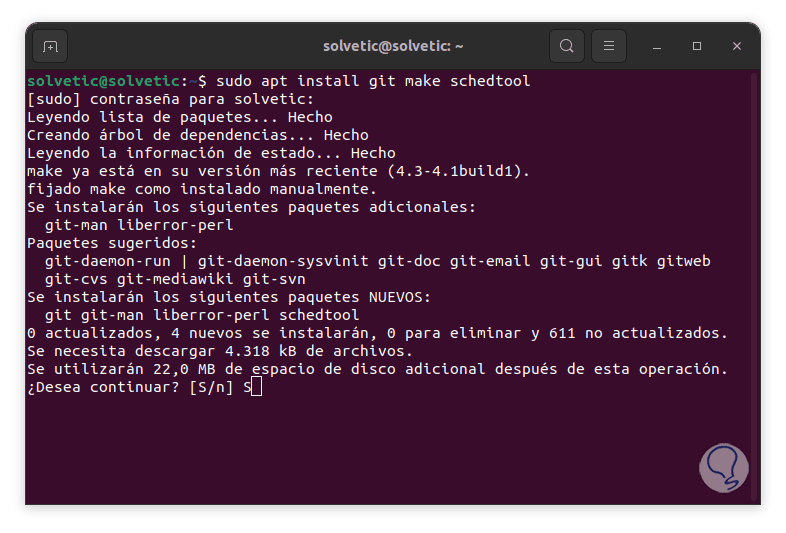 Ingresamos la contraseña y confirma el proceso con la letra S. Esperamos que llegue a su fin.