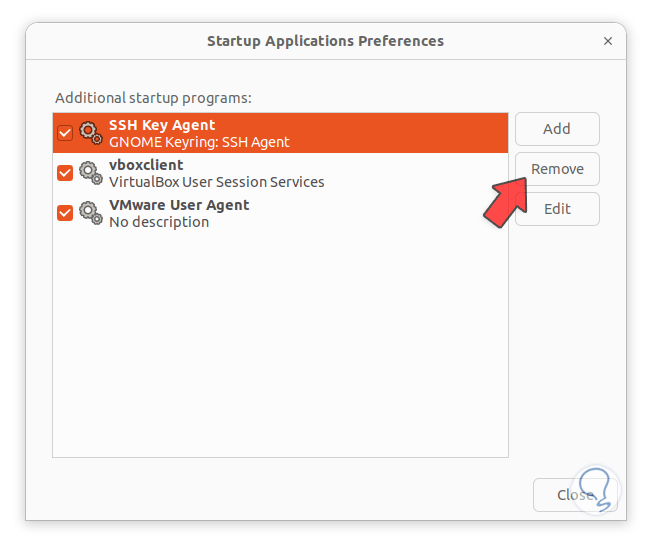 Pulsamos Enter y será posible eliminar apps que se inician con Ubuntu dando clic en "Remove":