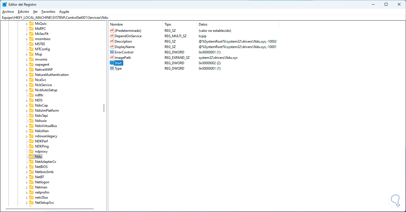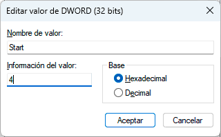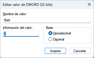 Damos doble clic sobre el valor "Start" para ver sus propiedades: