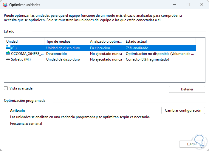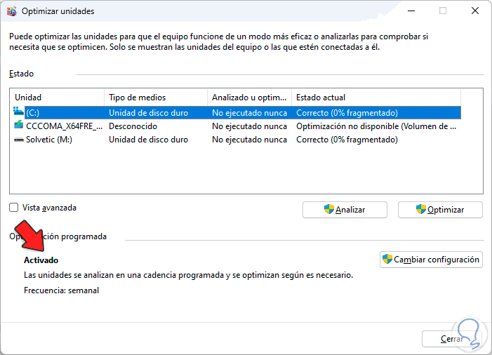 Da clic en "Optimizar" para mejorar el consumo de RAM debido a que este proceso se encarga de que las tareas de lectura y escritura del disco sean mucho más eficientes: