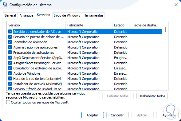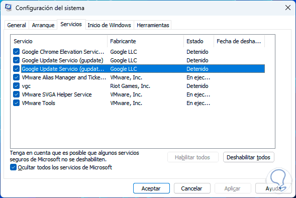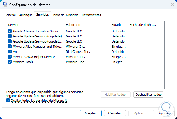 Activa la casilla "Ocultar todos los servicios de Microsoft":