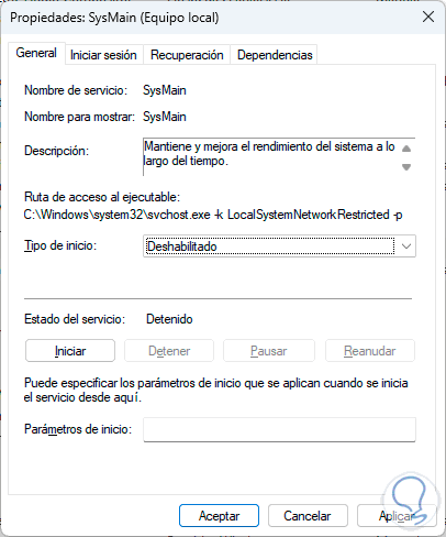 En "Tipo de servicio" establecemos "Deshabilitado":