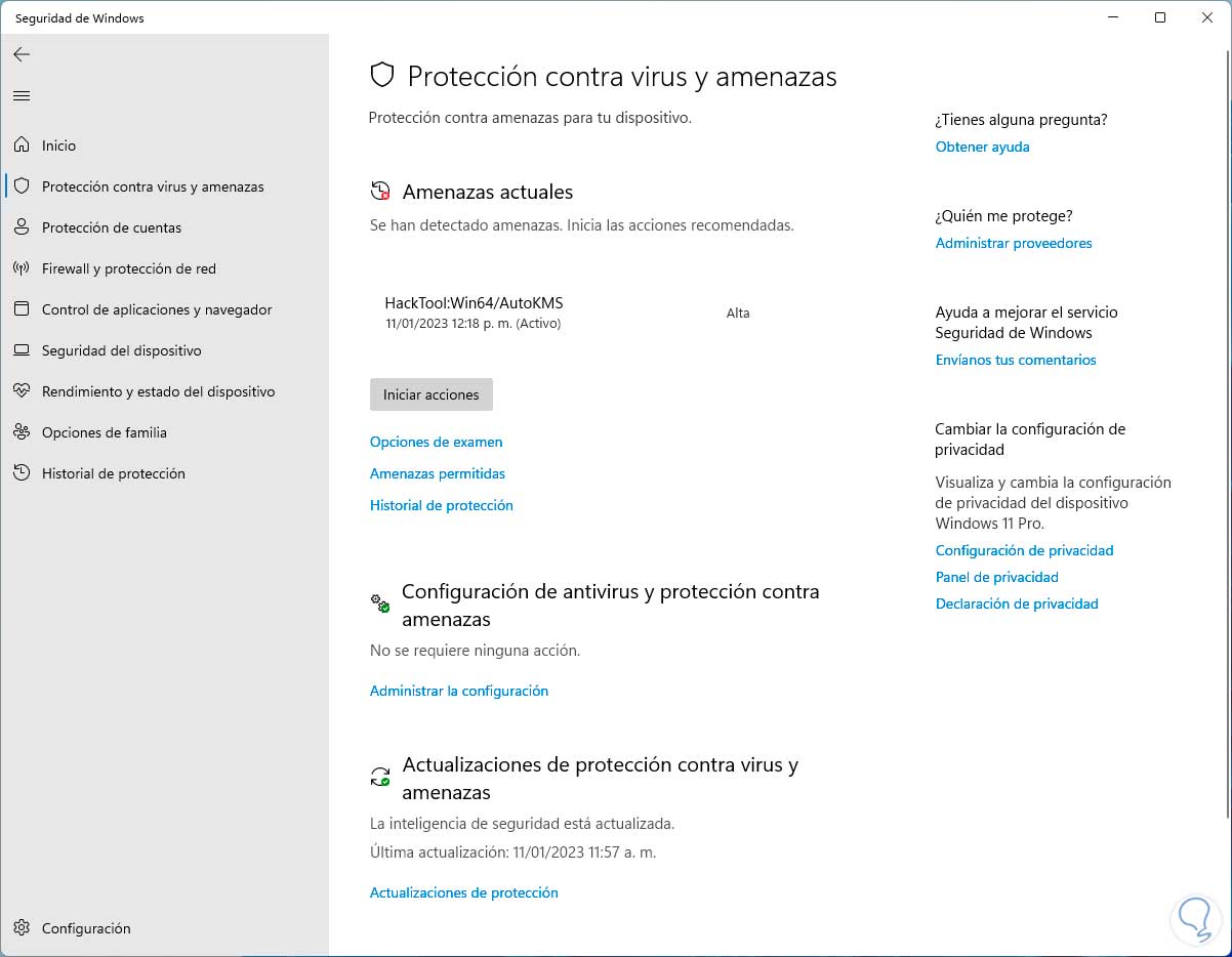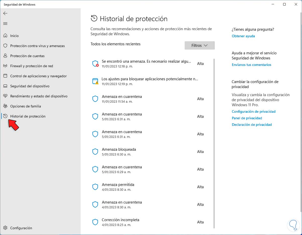 Damos clic en "Historial de protección" para ver un resumen de análisis previos: