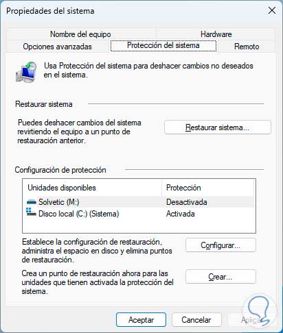 En Windows todos los componentes están ligados unos con otros y errores en el disco duro pueden conllevar a que la RAM se dispare en el sistema a niveles altos sin razón, podemos optimizar el disco para ver si esta es la causa, primero crearemos un punto de restauración como método de respaldo.