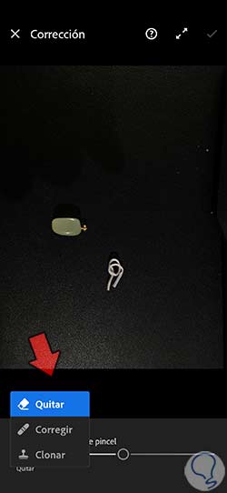 Aquí se abrirá un panel de opciones que podemos desplegar pulsando sobre la primera que nos aparezca en la parte inferior. Al lado veremos un regulador de tamaño de pincel para comenzar la corrección. Entre las opciones que podremos usar estarán: