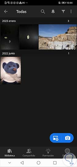Lo primero que haremos será buscar la fotografía sobre la que vamos a trabajar en Lightroom Mobile. Para ello podemos buscarla en algún álbum o carpeta donde la tengamos ya importada o añadirla de nuevas desde el icono de importar o de la cámara que aparece en la pantalla.