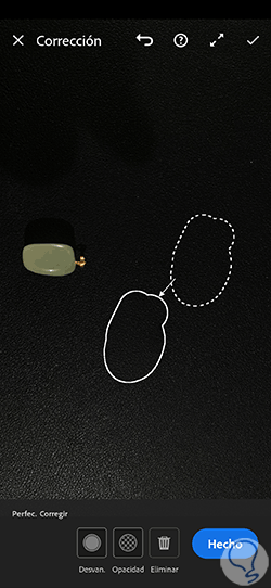 En la parte inferior vas a encontrar diferentes opciones de configuración para hacer la corrección. Podrás jugar con “Desvanecer” para hacer menos marcados los límites de la selección, así como su “Opacidad”. Si no te convence puedes “Eliminar” la selección y hacer otra de nuevo.