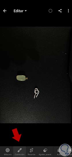 Para realizar tareas de corrección contamos con una serie de herramientas interesantes en Lightroom Mobile que nos permiten hacer correcciones eficaces desde nuestro dispositivo móvil. Para ver las opciones que disponemos pulsaremos sobre la opción de “Corrección”.