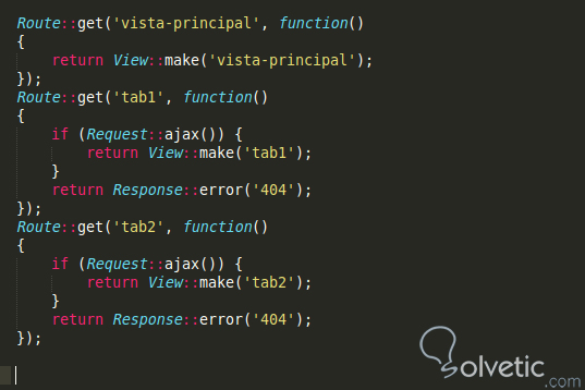 1- En nuestro archivo routes.php vamos a crear tres rutas donde cada una corresponderá a una página, en la primera haremos la vista principal y las dos siguientes serán quienes le suministrarán los datos a la primera. Vamos a colocar en las vistas secundarias una restricción para que solo sea bajo petición AJAX que nos despache el contenido: