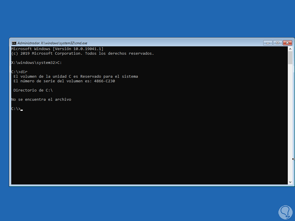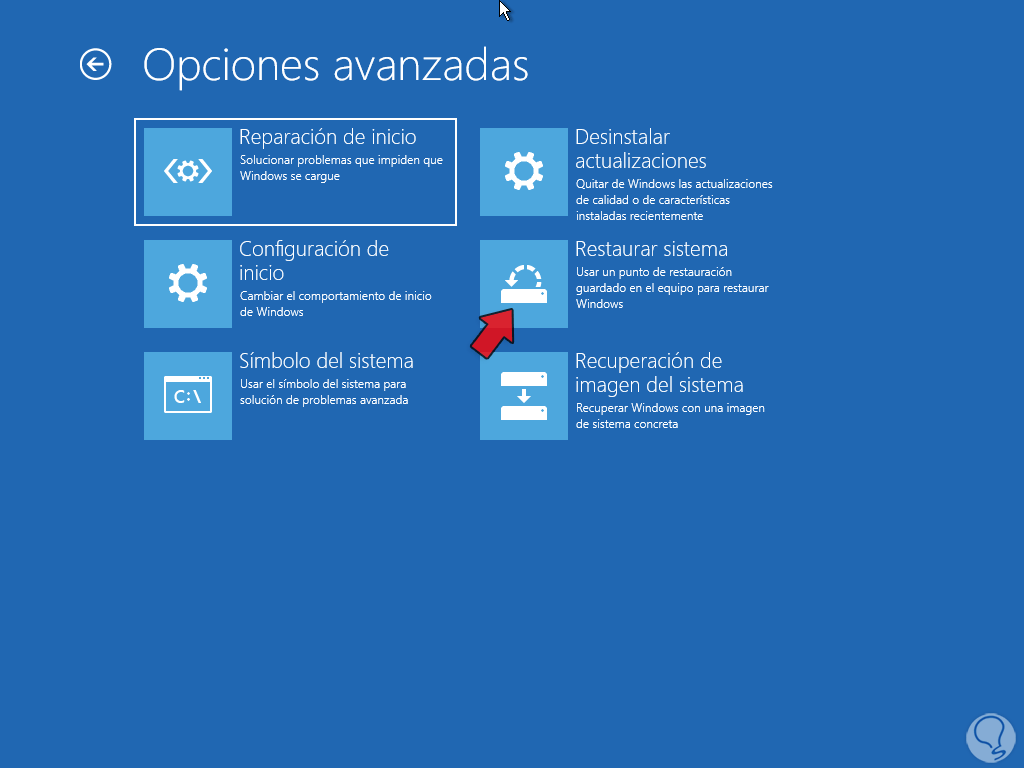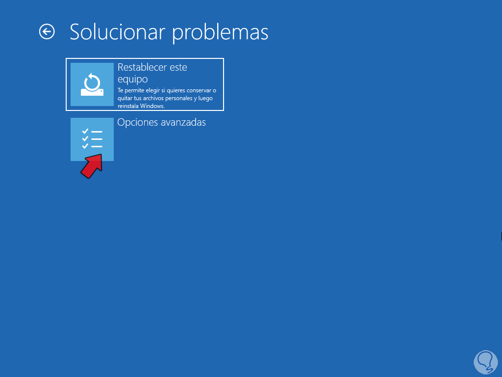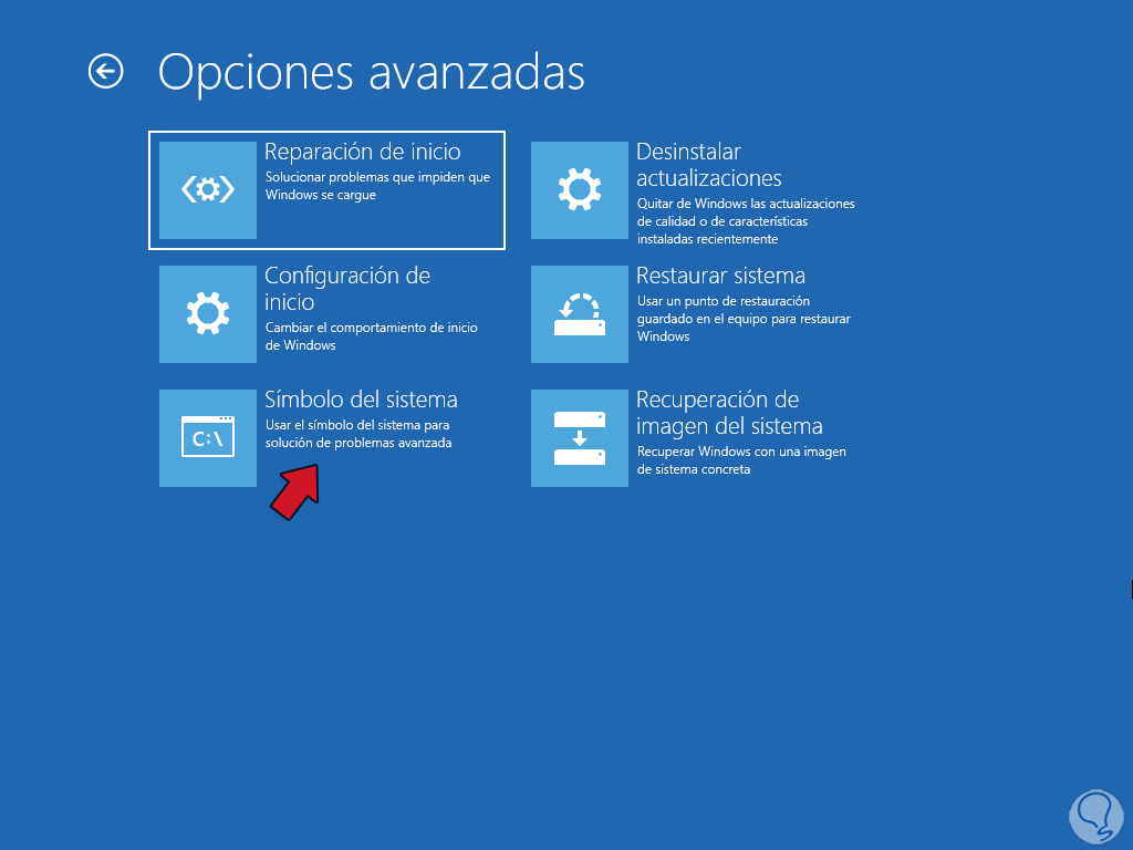 Alternativamente en "Opciones avanzadas" damos clic en "Símbolo del sistema":