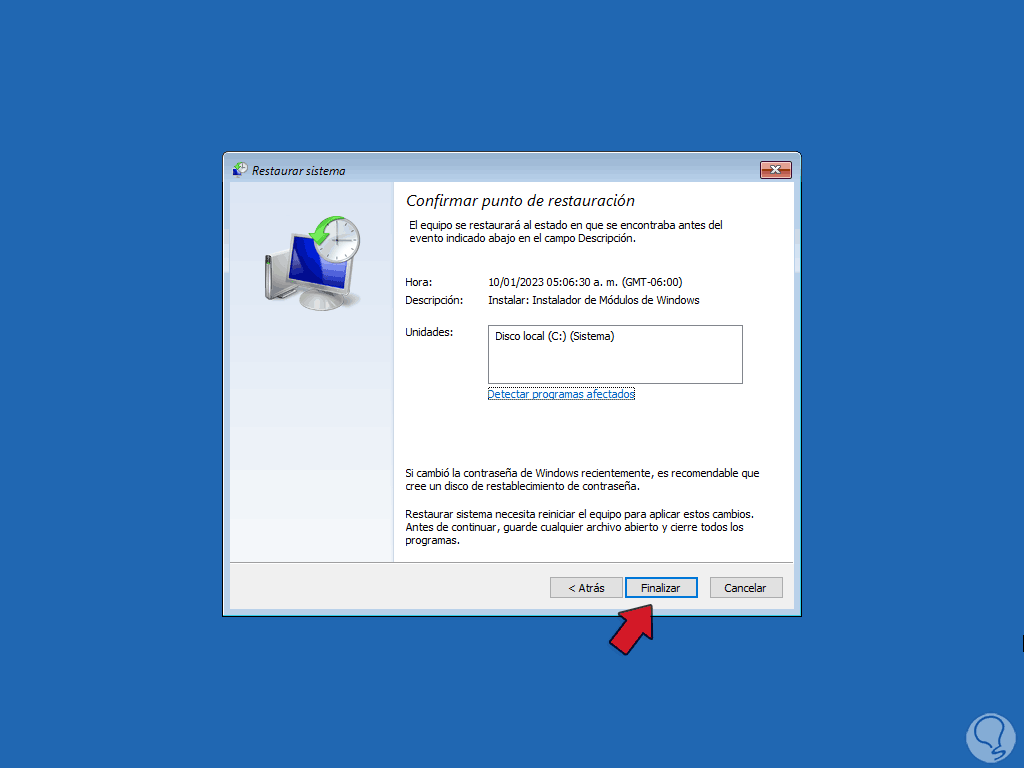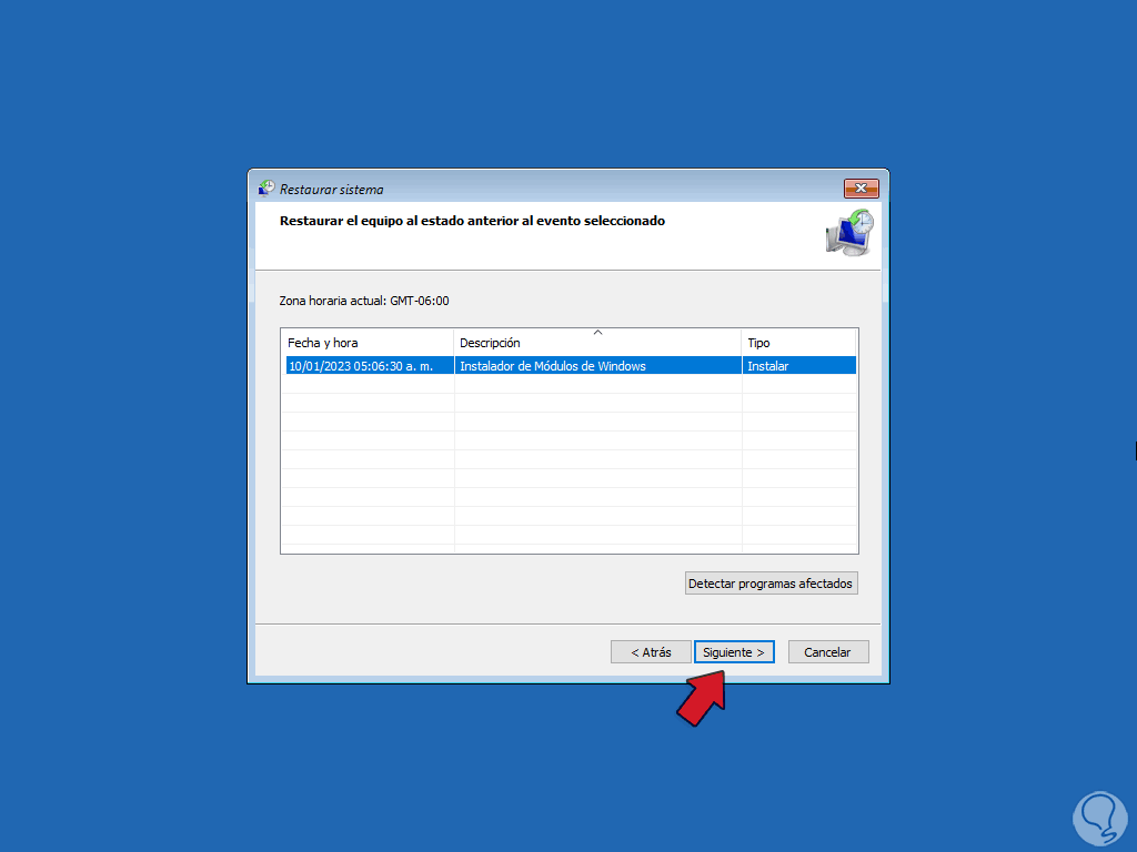 Seleccionamos el punto de restauración. Damos clic en Siguiente para ver un resumen del proceso de restauración a aplicar: